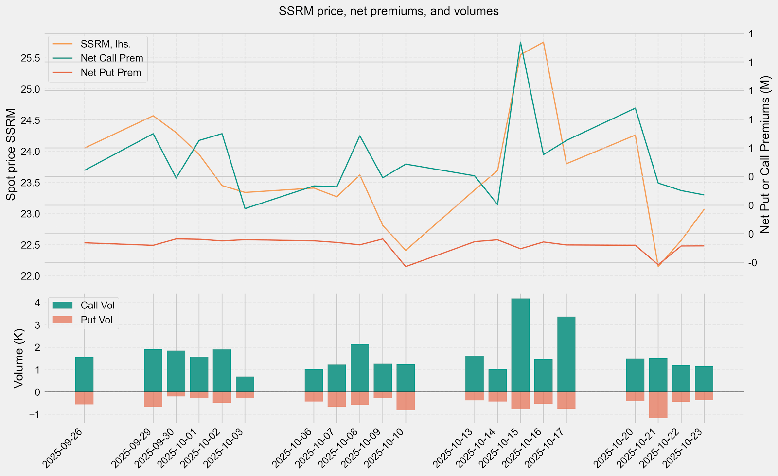 For traders, I think that means being careful about buying calls outright. Even if the stock pops on strong results, the implied volatility crush that follows could eat into gains fast. Personally, I’d rather sell puts a little below the current price — somewhere near that $21 strike — where the risk-reward looks more attractive. If SSR dips temporarily, I wouldn’t mind getting assigned there, because that level aligns nicely with the current GEX floor.