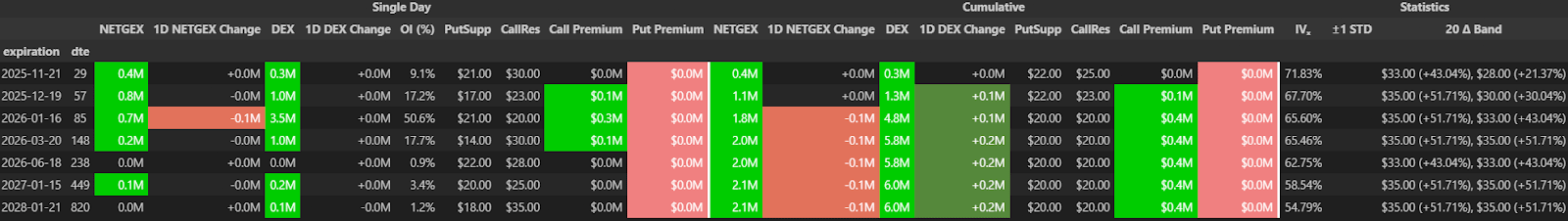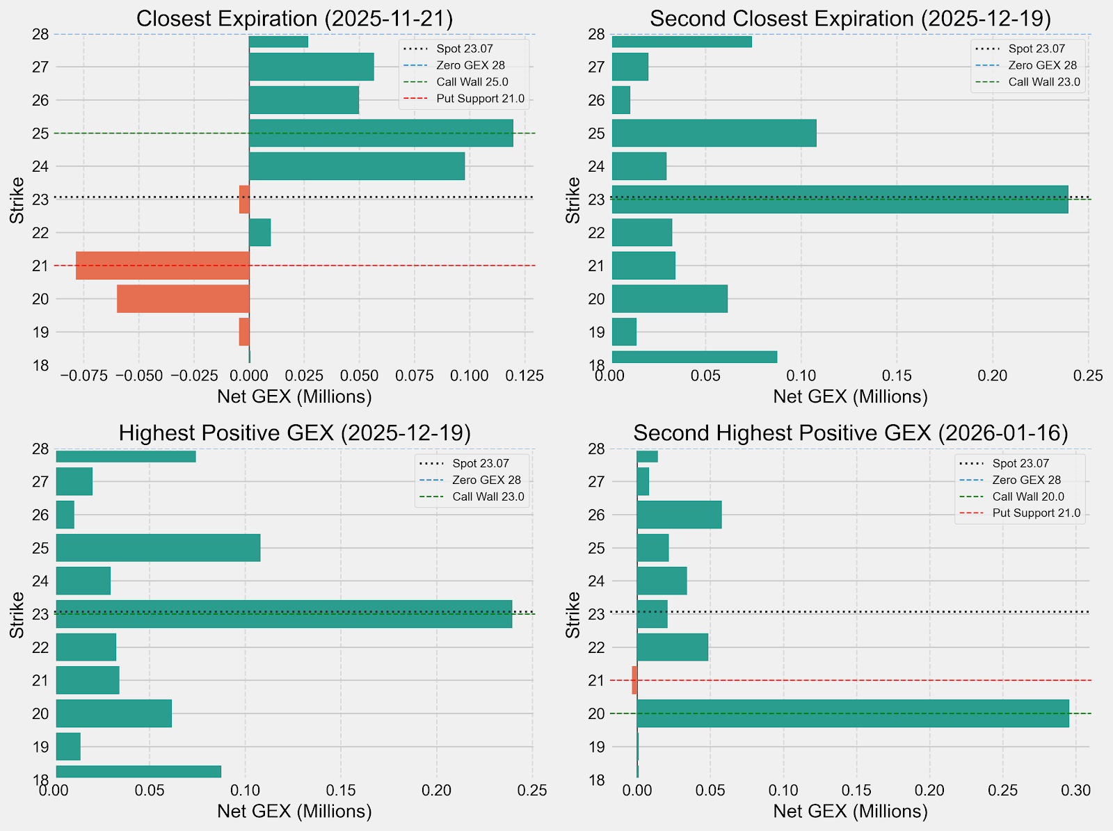 The December 19th expiration also stands out. It has the heaviest concentration of GEX and open interest, which tells me that institutions are holding positions further out, likely targeting either a continued gold rally or an extended period of strength in miners. The concentration around $23–$25 could act like a magnet if metals stay firm through the end of the year.