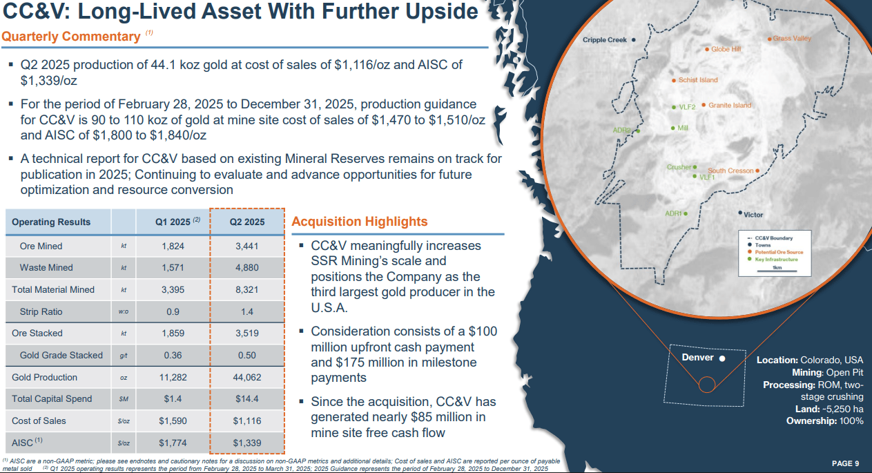 SSR Mining is a multi-asset gold and silver producer with operations spread across the U.S., Canada, Argentina, and Turkey. The company’s main revenue stream is gold, with silver contributing a smaller but meaningful share. Their key mines include Marigold in Nevada, Seabee in Canada, Puna in Argentina, and the newly acquired Cripple Creek & Victor (CC&V), which came from Newmont earlier this year.