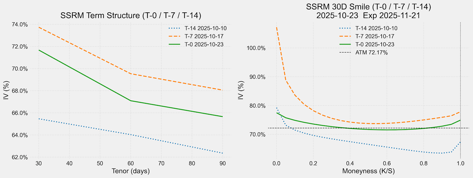 On the volatility side, things have calmed down a bit but not completely. Implied volatility has come down from its mid-October highs, though it remains slightly elevated compared to two weeks ago. That’s typical before earnings. The market tends to build a small volatility premium into the near-term contracts, and we can already see that in the November 21st options.