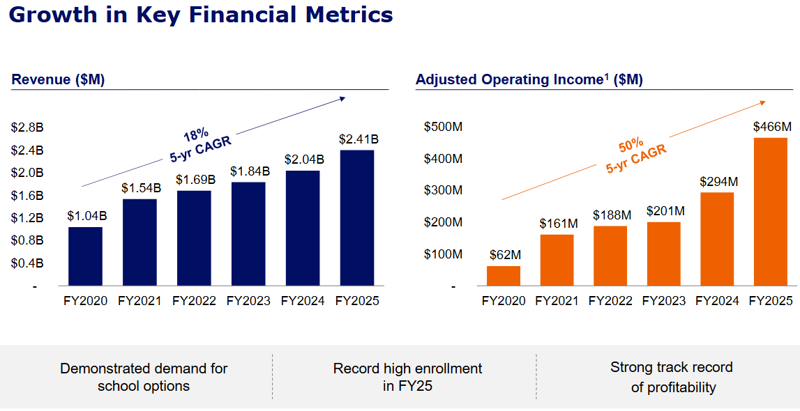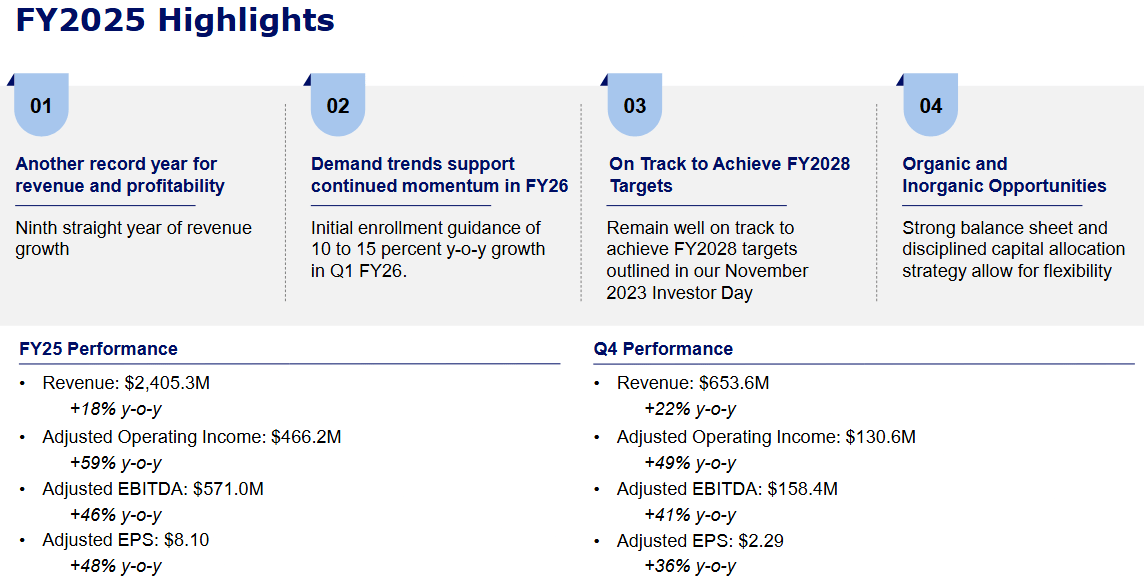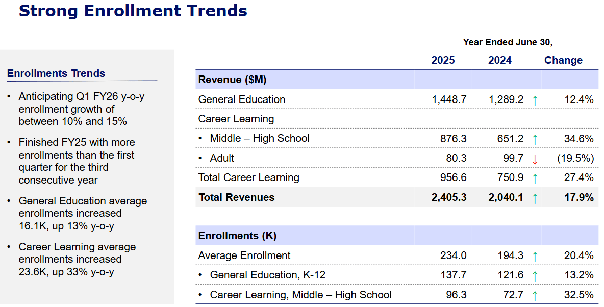 For Q1 FY2026, management guided to 10–15% enrollment growth, revenue per enrollment flat to slightly higher, and margin expansion that continues but at a calmer pace. Full-year revenue is expected between $2.47 and $2.55 billion, with adjusted operating income of $205–$220 million.