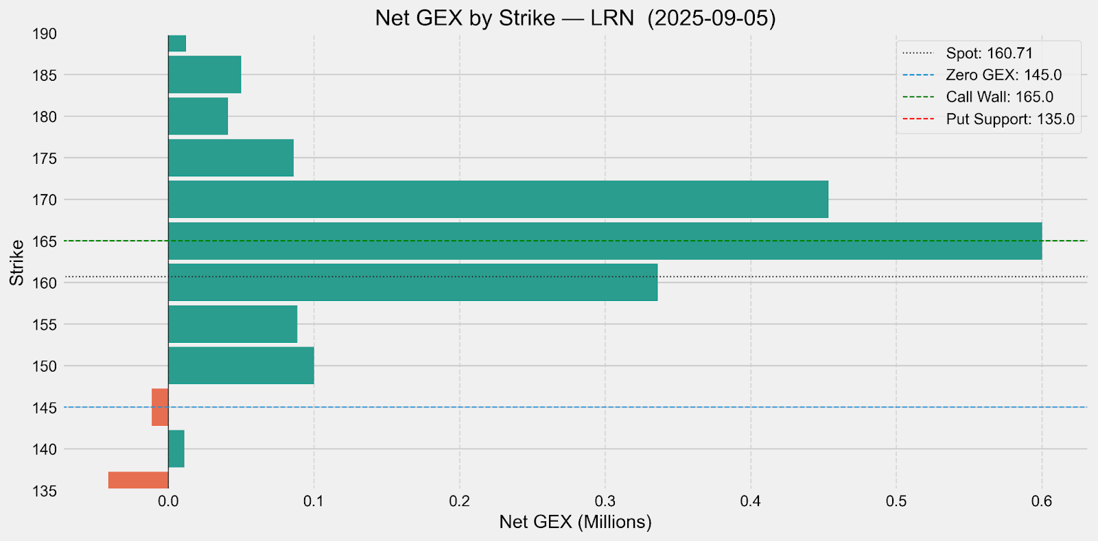 Options flow told the same story. Calls were heavily bid at the $165 and $170 strikes. Put activity was light, which left the stock with very little downside insurance. When that happens, dealer hedging flows create a feedback loop: price goes up, dealers buy more to hedge calls, which pushes price higher. Pullbacks stay shallow because there’s no big put demand to cushion them.
