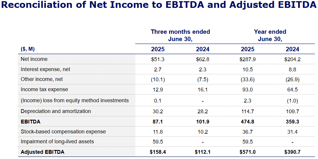 Margins followed the same direction. Adjusted operating income climbed to $119.8 million, up 14% from the prior year. Adjusted EBITDA rose to $146.7 million, compared with $129.1 million a year ago. Net income came in at $76.9 million, or $1.65 per share, versus $68.1 million, or $1.47, in FY2024.