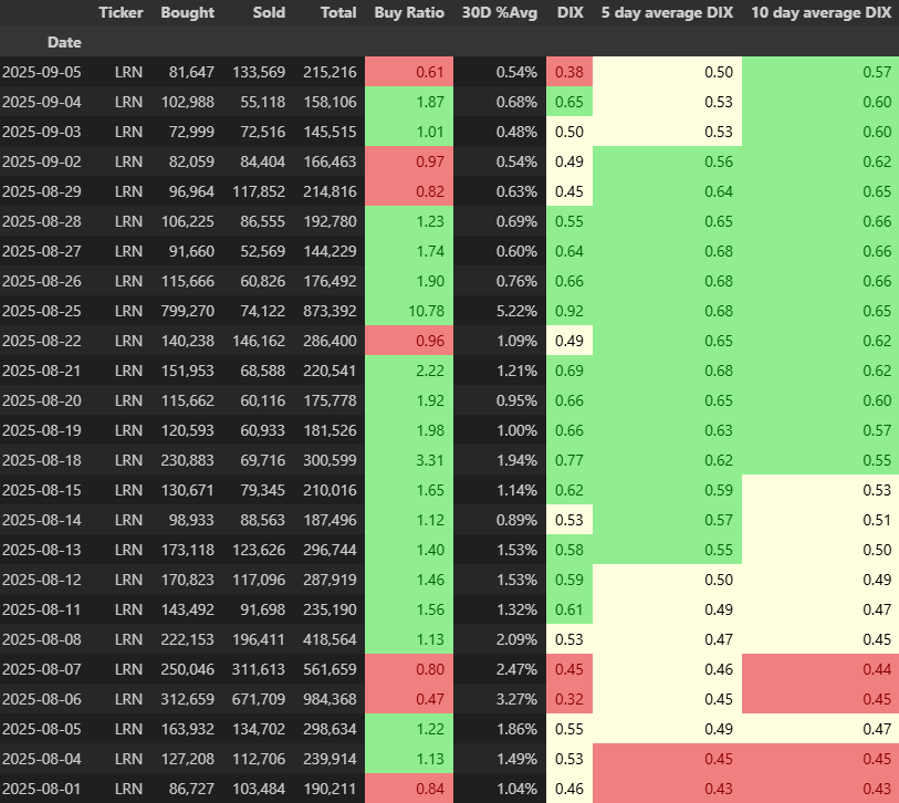 In August and September, dark pool activity in Stride turned decisively bullish. Buy ratios flipped green, and the DIX (Dark Index) climbed into the 0.6 to 0.7 range. In my experience, DIX readings above 0.6 are not noise. They’re real accumulation. And the timing lined up almost perfectly with the stock’s breakout.