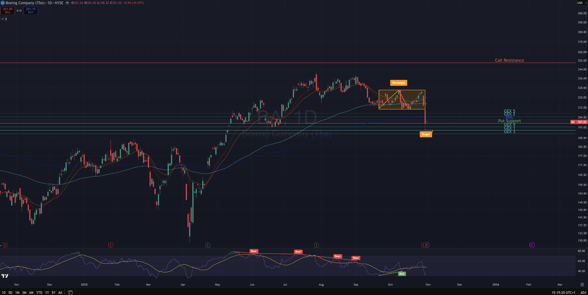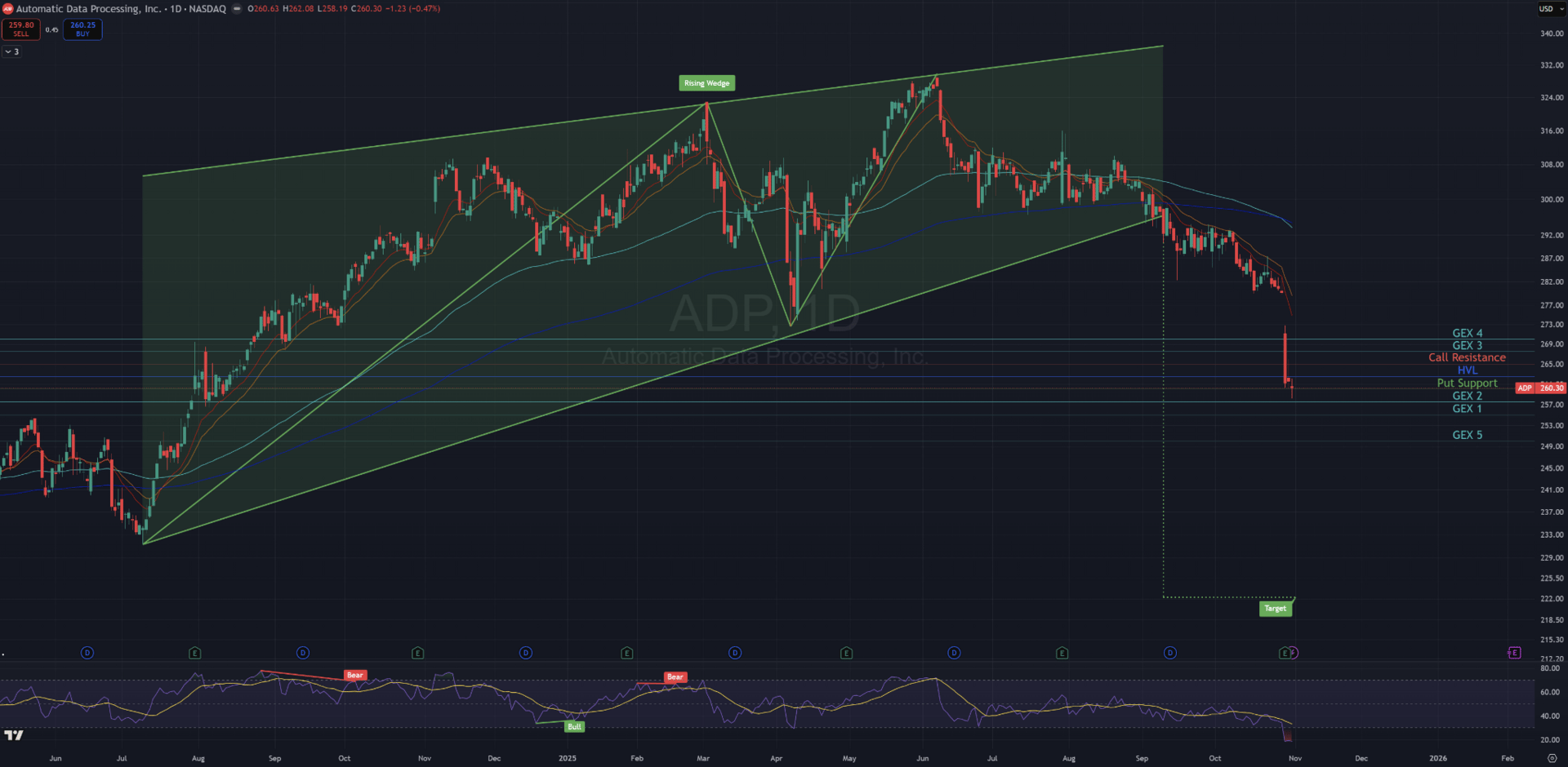 ADP had one of the cleaner technical breaks lately. It fell straight from the upper end of a rising wedge and landed right on a multi layered put support zone near 260. That’s typically where the downside slows down as gamma turns positive again. The setup here looks oversold on the RSI, and the structure suggests at least a short term recovery bounce. If the market holds up, a move back into the 270 to 275 range wouldn’t surprise me.