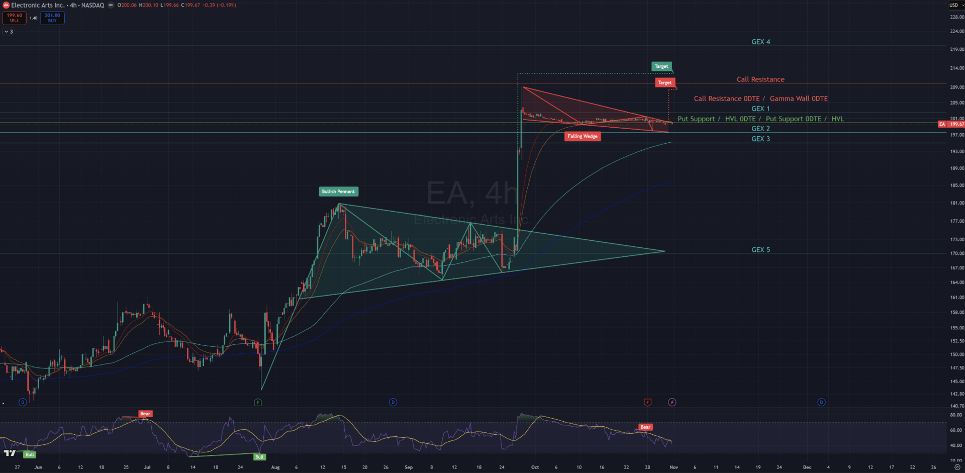 EA had a sharp breakout earlier in October, then pulled back into what looks like a falling wedge sitting right on top of put support. That’s often where market makers start buying the underlying to hedge short gamma, which can create a small reflex bounce. The stock also held the previous breakout zone from the bullish pennant that formed in September, so there’s still a clear higher low structure in place. If this area around 197 to 200 holds, I think it could easily retest the 205 zone, which also lines up with the first GEX level and short term call resistance.