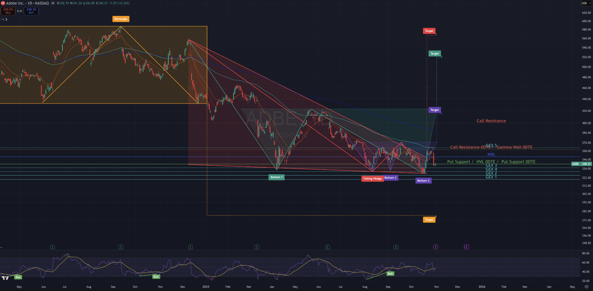 Adobe’s been in a long consolidation phase, and the recent move out of the falling wedge looks encouraging. The chart shows three clear bottoming attempts and a strong bounce right off put support near the 330s. When a name like this lines up GEX and HVL levels that tight, it usually means there’s real dealer activity balancing the options book. If that holds, there’s room for a push back toward 370, and possibly a bigger measured move toward 400 if the broader tech rally continues.