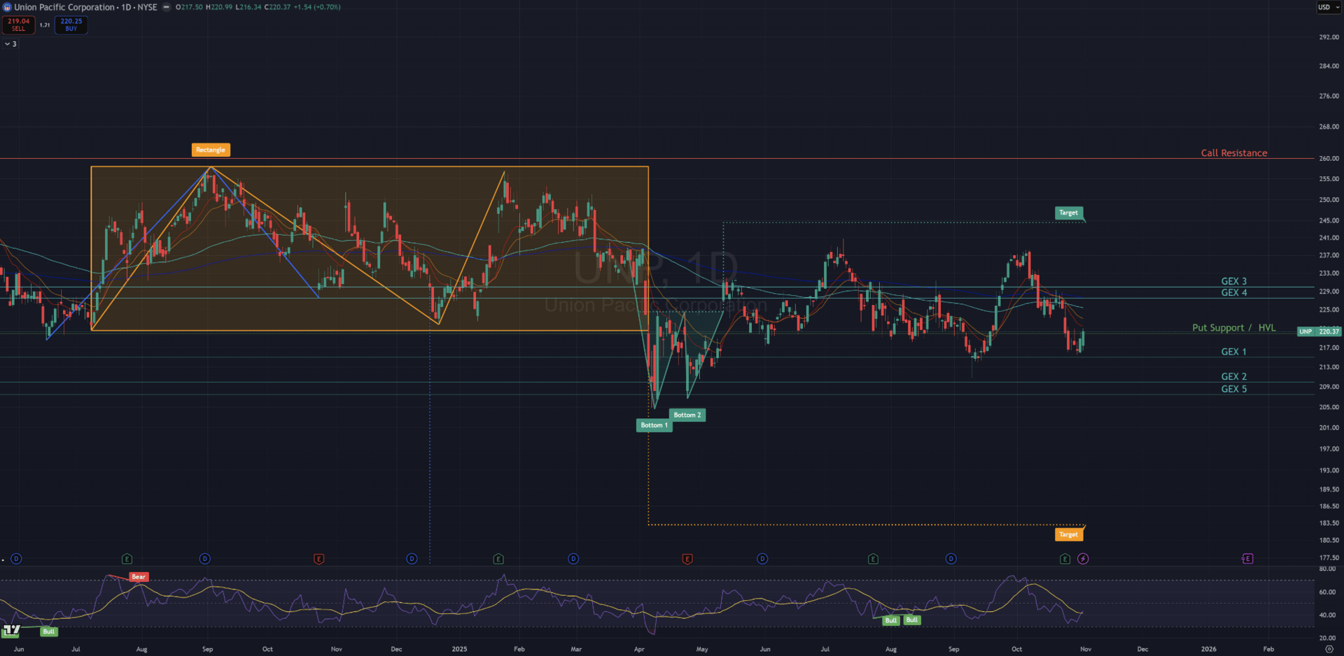 UNP is one of those quiet setups that tends to get overlooked. After a double bottom near 200 earlier this year, it’s now testing the same GEX and HVL zone again, right around 217 to 220. That’s a typical range where market makers step in to buy shares as their short puts decay, which often leads to a grind higher. The RSI also shows a little uptick from oversold territory, suggesting momentum might start turning up. A rebound toward 230 to 235 seems reasonable if this level holds.